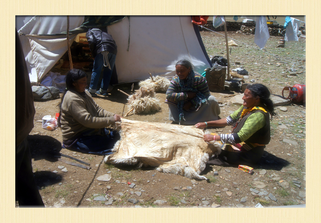 davanti alla tenda mentre si lavora una pelle di capra Ladakh - India settentrionale |